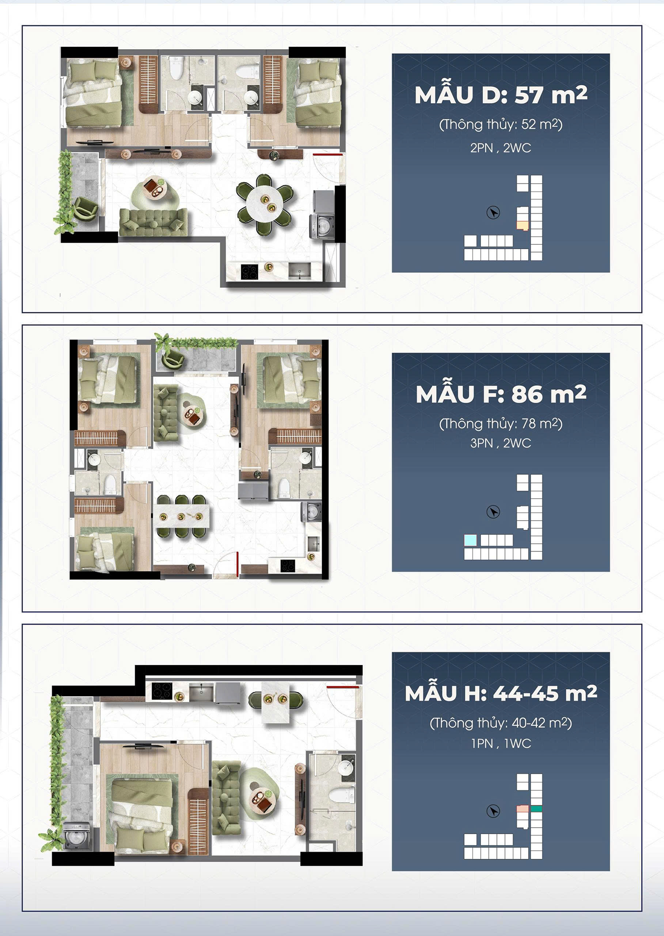 Sau đây sẽ là mẫu thiết kế căn hộ từ 44m2 đến 86m2 tương ứng với căn hộ từ 1PN đến 3PN