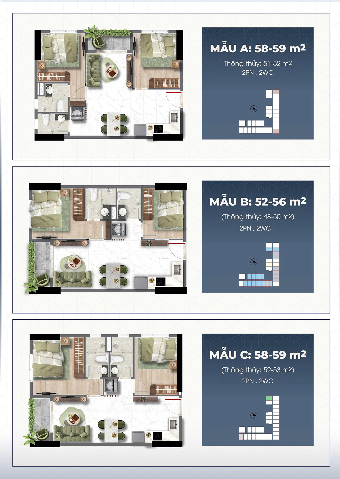 | Căn 2PN | 52 – 59 m² | Từ 2,9 – 3,5 tỷ |